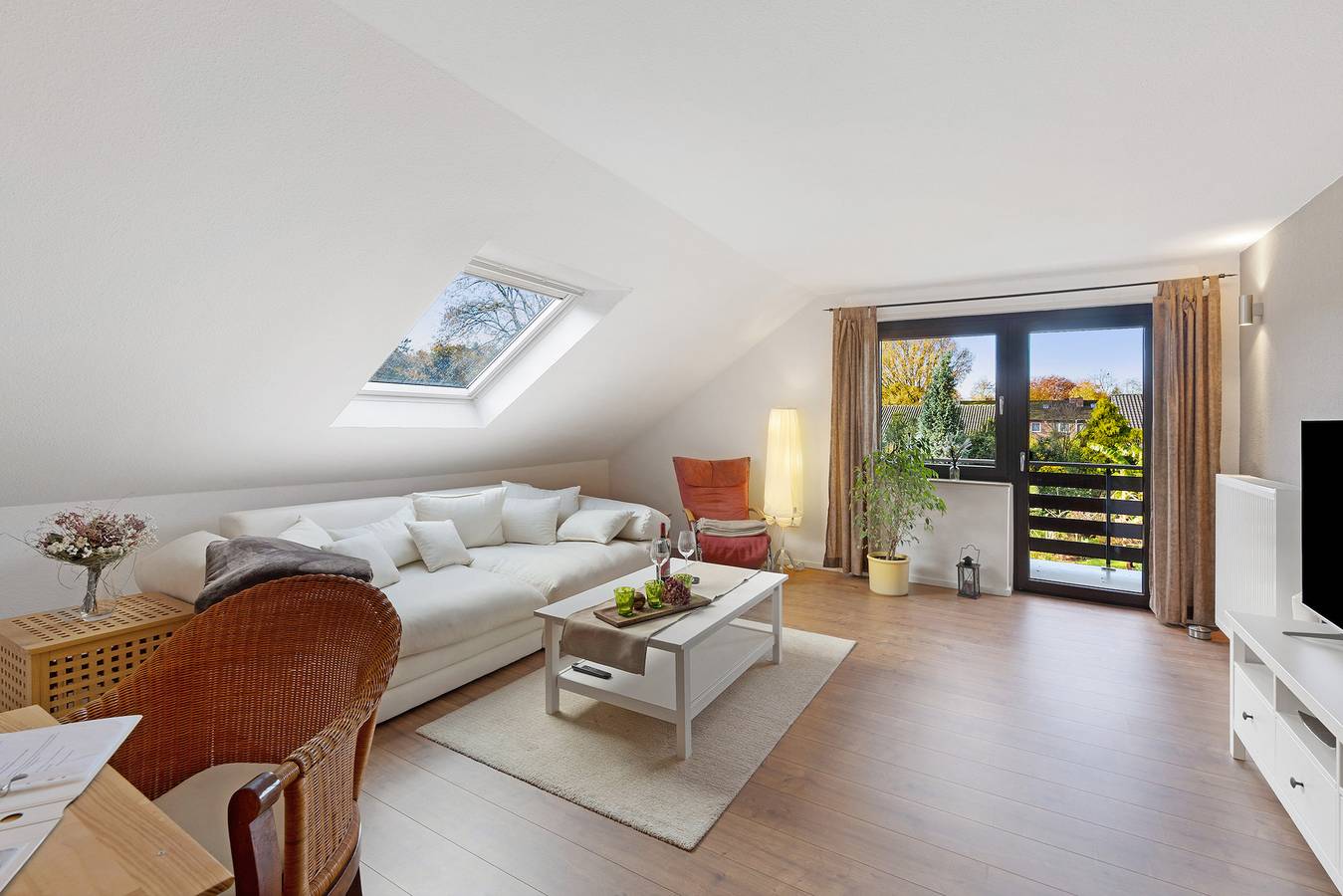 Hier ist auch ein Zugang zum Balkon, der sich über die komplette Hausbreite erstreckt (ca. 10 x 1,20m) und Blick in den schönen Garten bietet. Das Wohnzimmer ist ebenso groß und gemütlich eingerichtet.