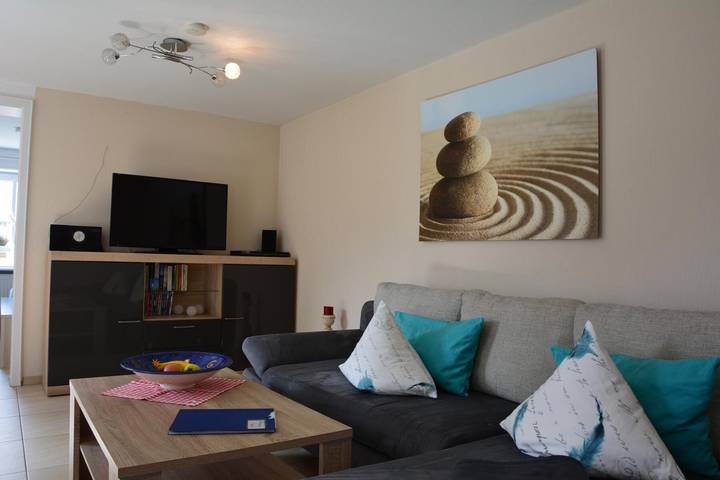 Die Ferienwohnung ist komplett renoviert, hochwertig, modern, hell und komfortabel eingerichtet. Sie betreten die Wohnung über den vorgelagerten Sküll. Alle Zimmer sind mit einem hochwertigen Fliesenboden zum Teil mit eingearbeitetem Mosaik ausgestattet. Hochwertige Möbel mit Markengeräten in Wohnzimmer und Küche ergänzen die Ausstattung.. In einem kleinen Abstellraum finden ihre Koffer Platz. Vom Schlafzimmer haben die direkten Blick auf ihre eigene Terrasse.