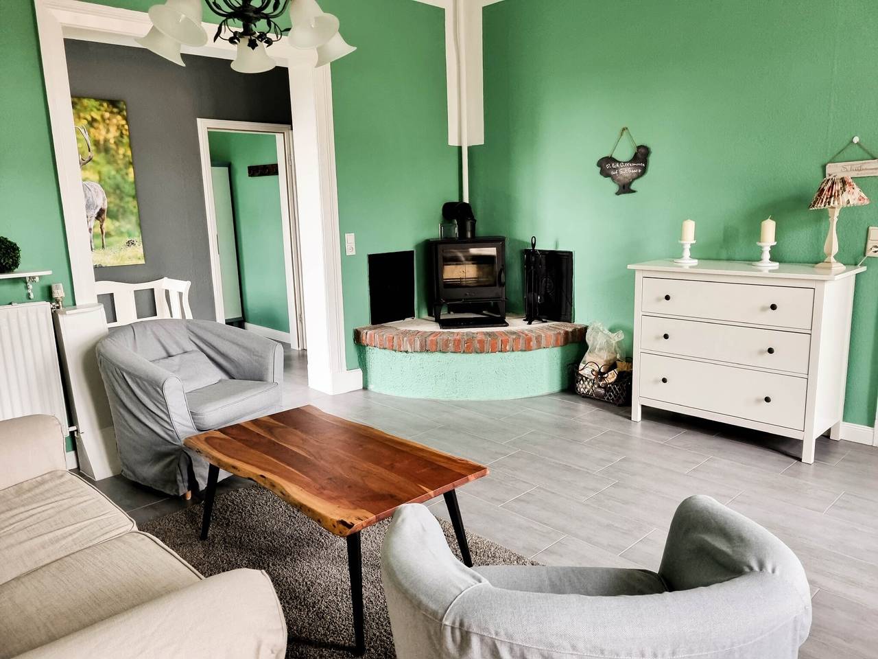 Innenbeschreibung - Sie betreten die Ferienwohnung im Erdgeschoß durch die Eingangstür links im Kavaliershaus und gelangen in den Wohnbereich, der Sie durch seine Großzügigkeit willkommen heißt. Die weißen Möbel und Sessel lassen so manches Herz höher schlagen und strahlen Gemütlichkeit aus. Dieser Platz ist sehr gut geeignet für entspannende Lesestunden, aufregende Spielrunden oder gesellige Fernsehabende. Der schöne Kamin sorgt an kalten und verregneten Tagen für wohlige Wärme am knisternden Kaminfeuer.