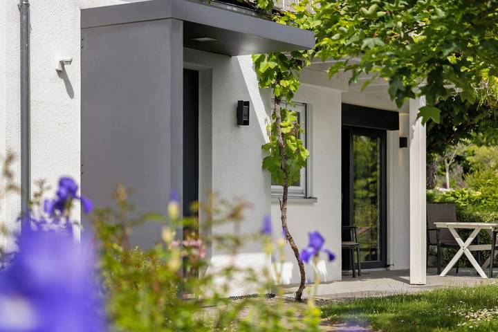 Die Ferienwohnung verfügt über einen privaten Außenbereich mit Garten, offener und überdachter Terrasse sowie einem Grill. Öffentliche Verkehrsmittel sind fußläufig erreichbar.